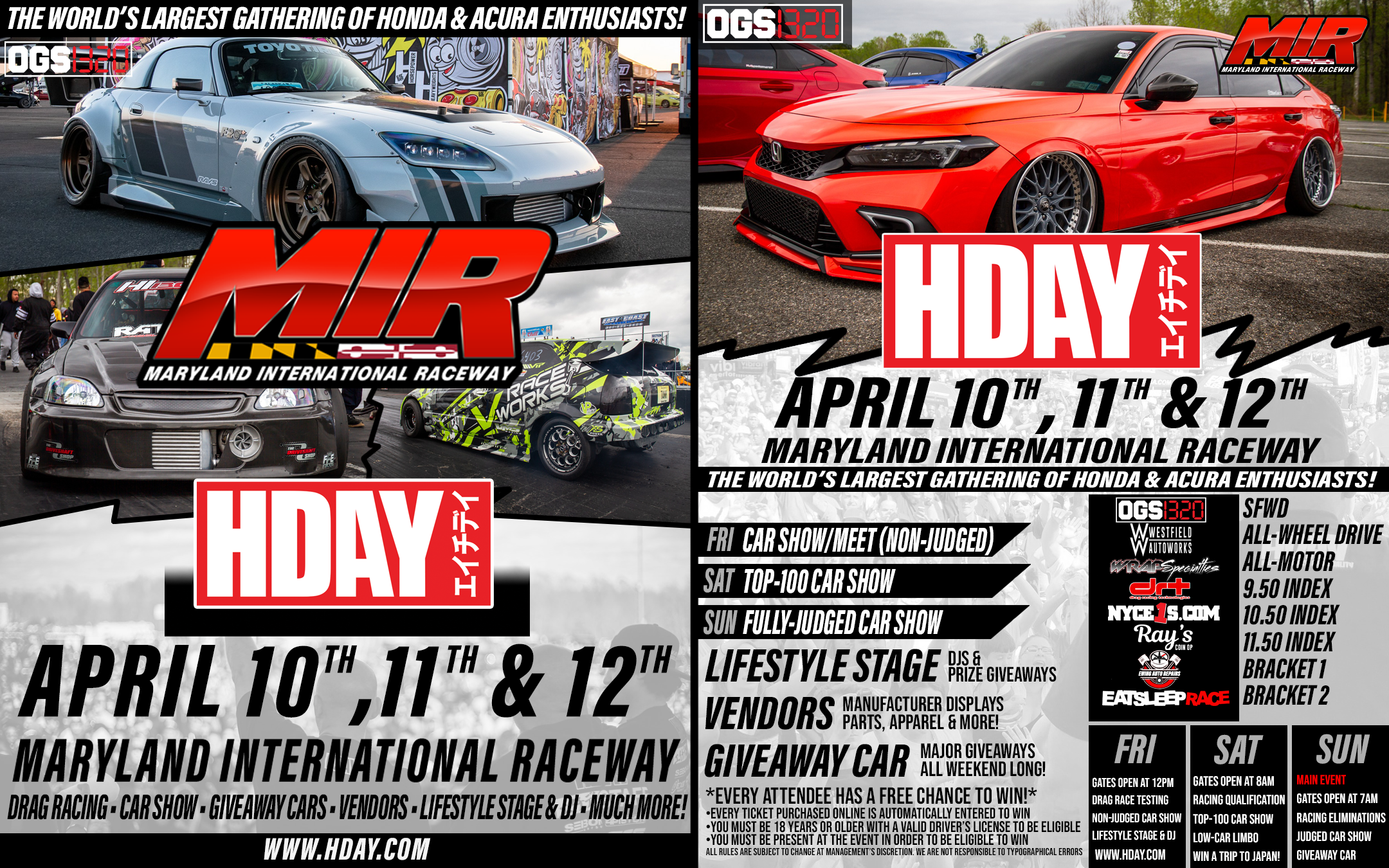 Established in 2002, HDAY is the WORLD'S LARGEST gathering of Honda and Acura enthusiasts. Expanding over an entire weekend, experience the thrill of drag racing featuring some of the fastest Hondas & Acuras in the world.