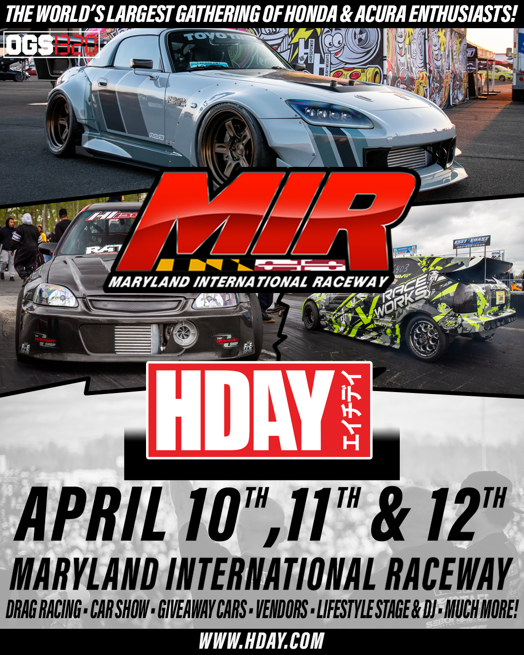 Established in 2002, HDAY is the WORLD’S LARGEST gathering of Honda and Acura enthusiasts. Expanding over an entire weekend, experience the thrill of drag racing featuring some of the fastest Hondas & Acuras in the world, explore hundreds of show-stopping builds in the car show, and shop from a wide range of vendors. The event also brings high-energy entertainment with a live DJ, prize giveaways, contests, giveaway cars, and the always crowd-favorite low car limbo. With exciting activities, exclusive giveaways, and a passionate community, HDAY is the ultimate celebration of Honda and Acura culture.